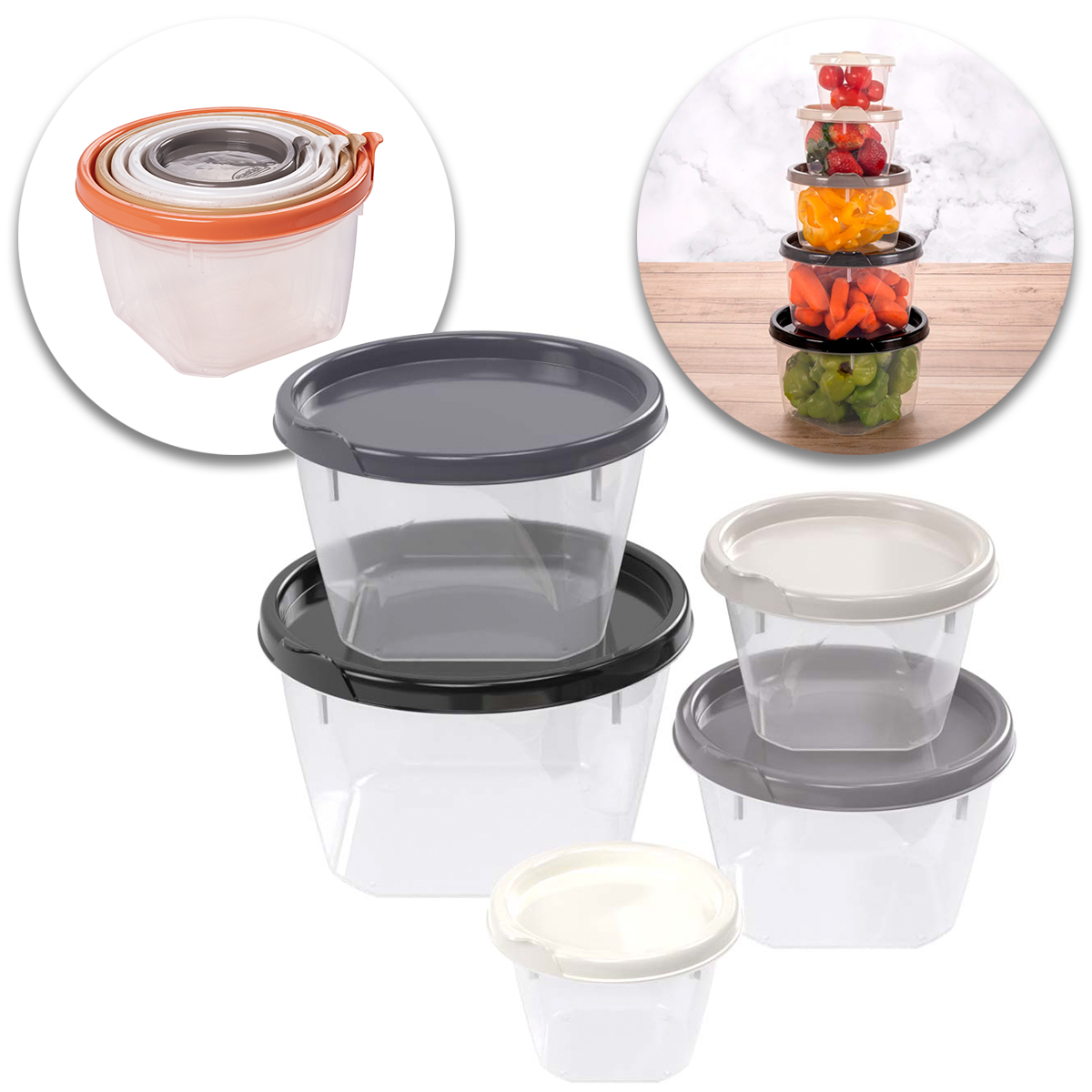 Este conjunto prático e versátil de potes de plástico é ideal para otimizar o espaço e manter sua cozinha organizada. Composto por 5 tamanhos variados (130ml, 240ml, 430ml, 700ml e 1,05L), seu design permite que as bases e tampas se encaixem perfeitamente, facilitando o armazenamento quando não estão em uso. Produzido em polipropileno, é um item seguro e funcional para diversas necessidades.